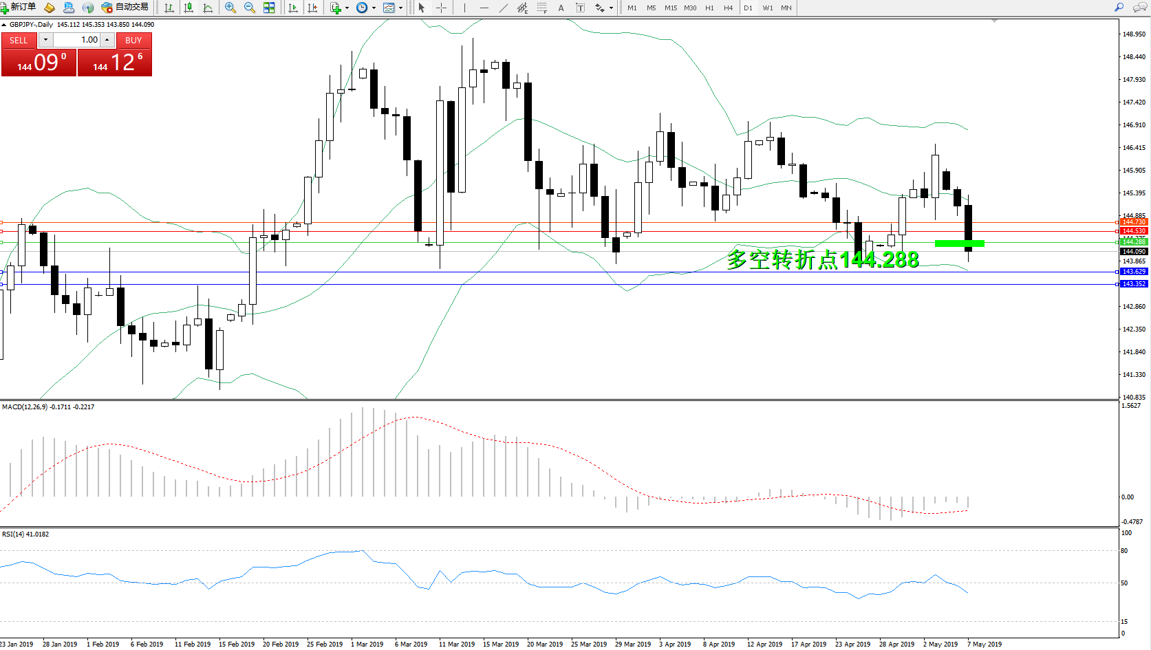 交易策略:144.288下方看跌,目标143.629、143.352