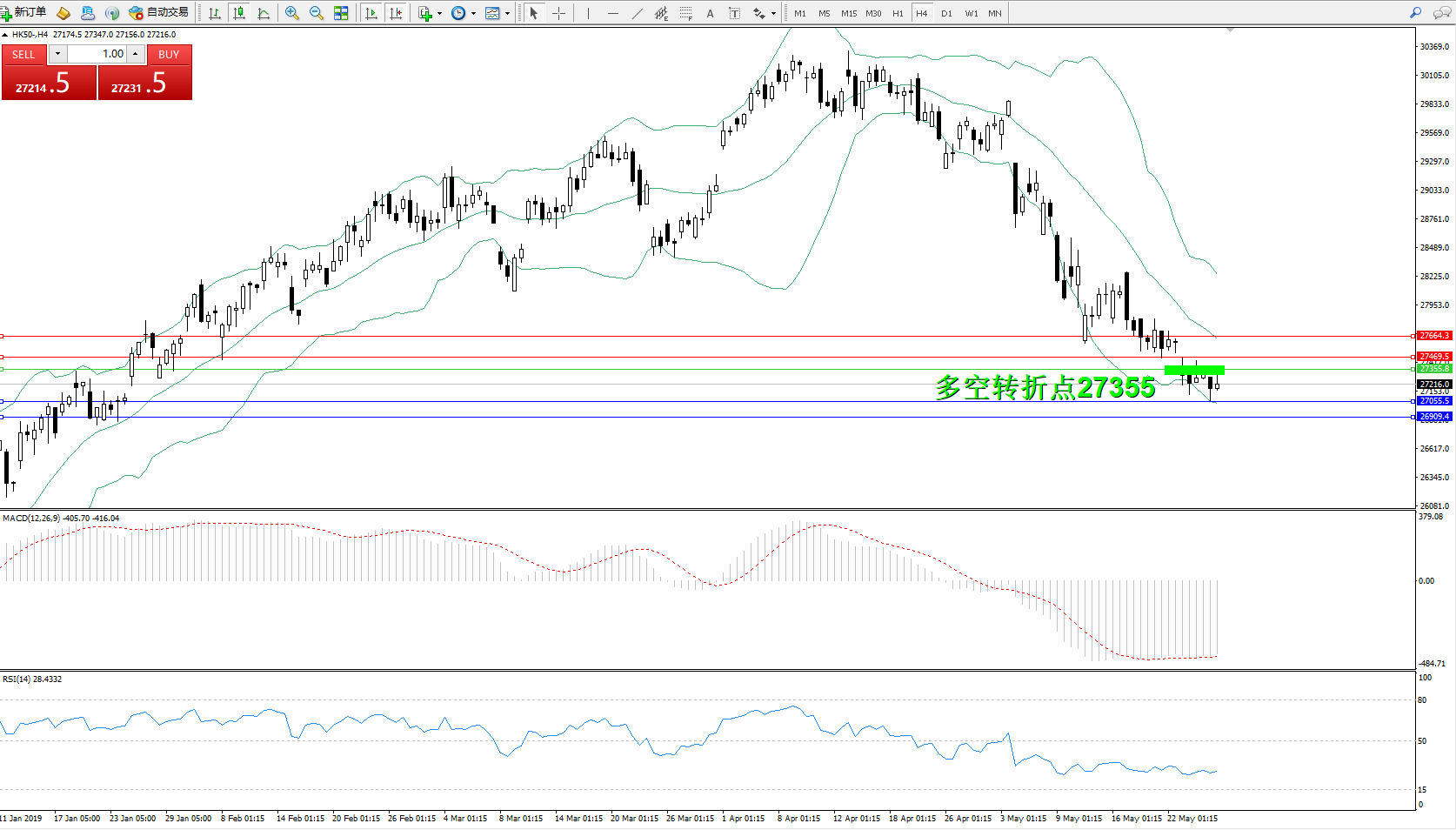 恒指HK50 ——4小时K线图显示: