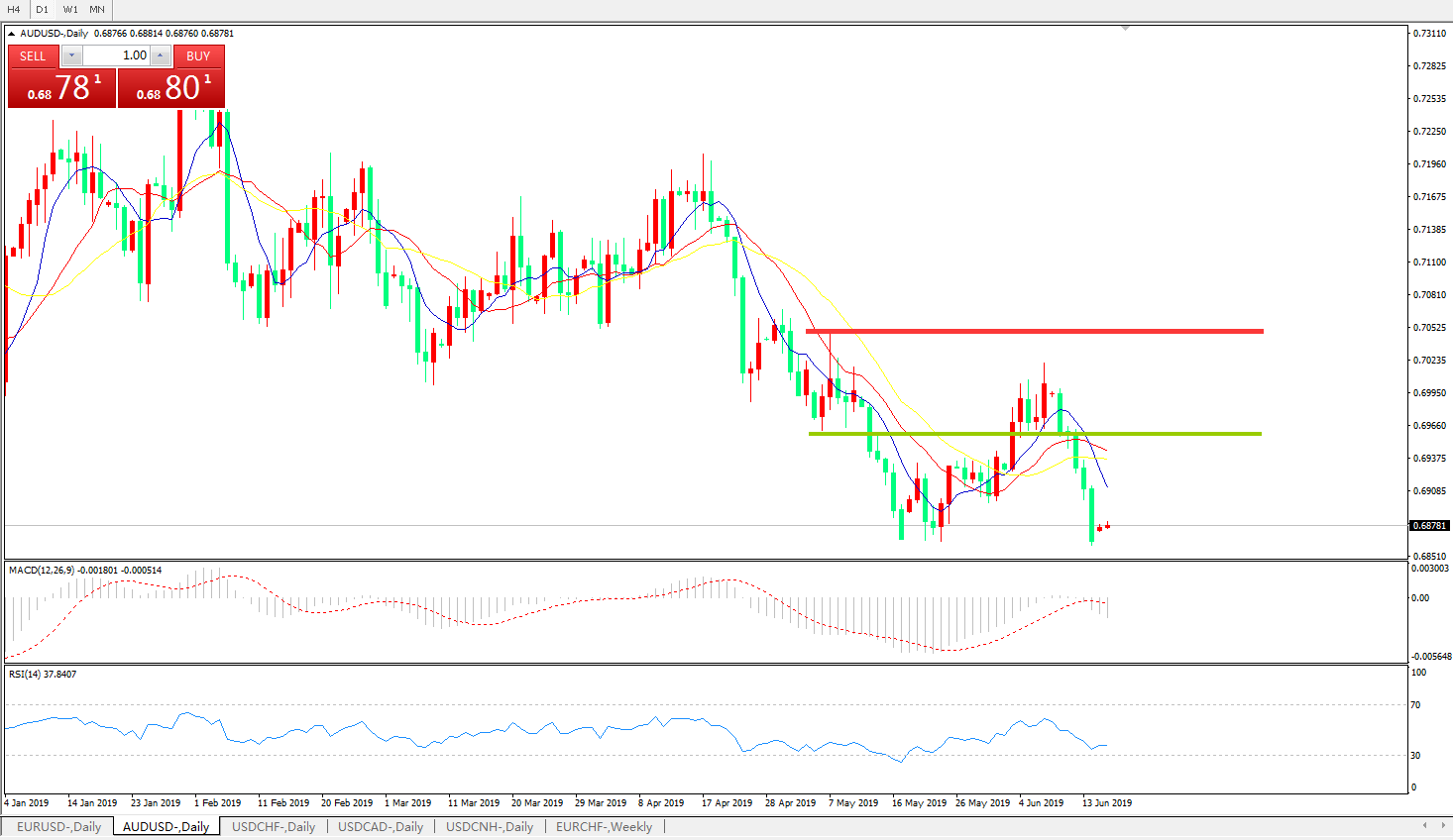 技术面简析:日图均线再度死叉下行,价格持续大幅回落,MACD在0轴下方有持续放量,RSI持续走低,预计汇价将继续走低,大概率蒋打破前低下行。