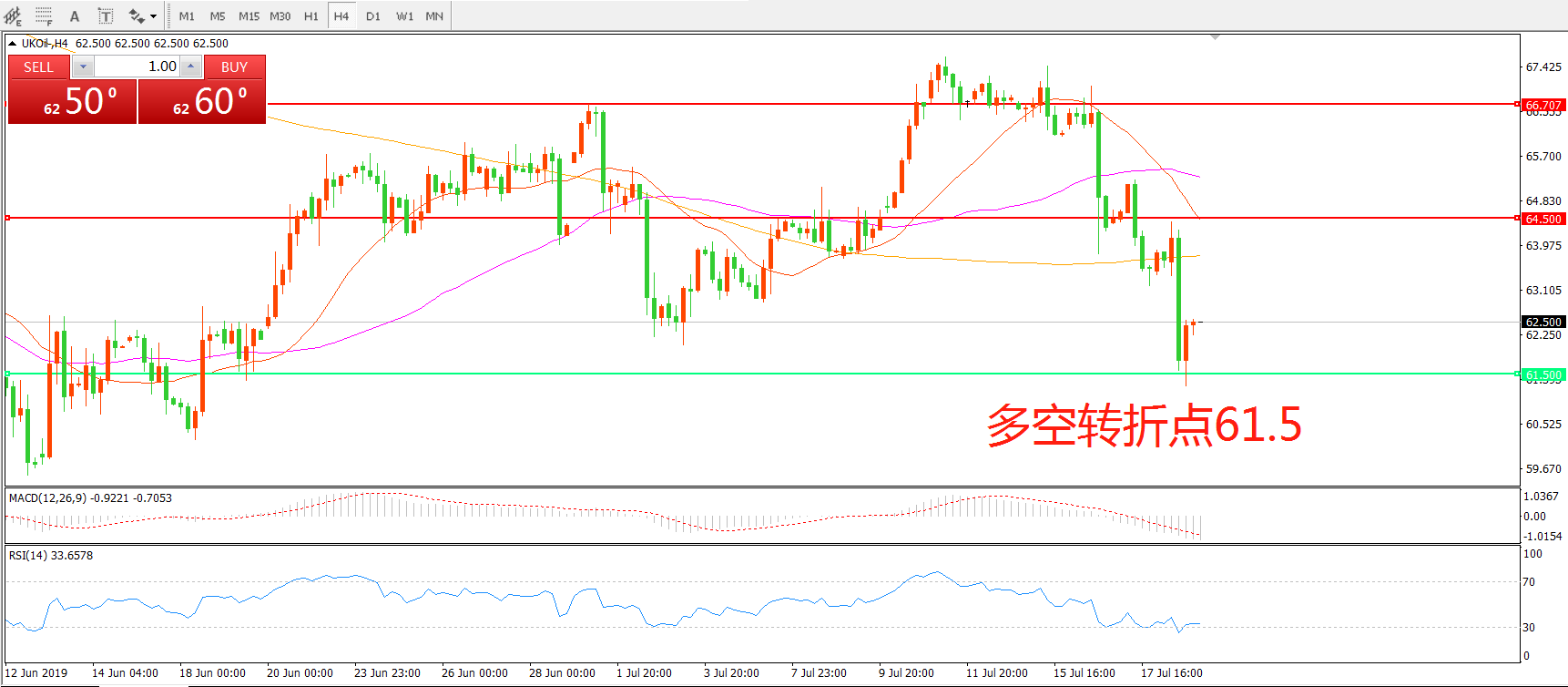 4小时图看,油价长阴破位,无力收复,200周期均线形成上方阻力,  RSI指标走平,日内小幅反弹成为可能。