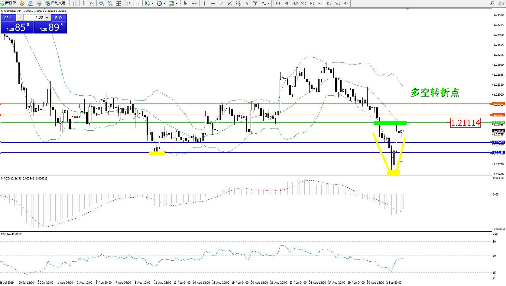 交易策略:1.21114下方看跌,目标1.20483、1.20158