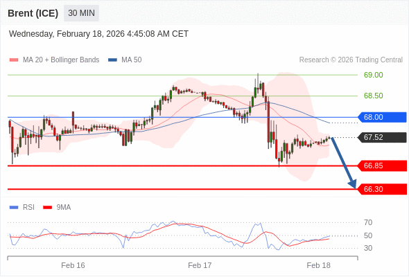 交易策略: 在 68.00 之下,看跌,目标价位为 66.85 ,然后为 66.30 。