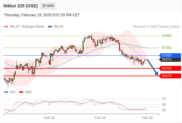 交易策略: 在 57090 之下,看跌,目标价位为 56700 ,然后为 56470 。