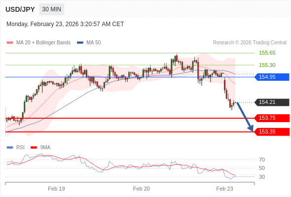 交易策略: 在 154.95 之下,看跌,目标价位为 153.75 ,然后为 153.35 。