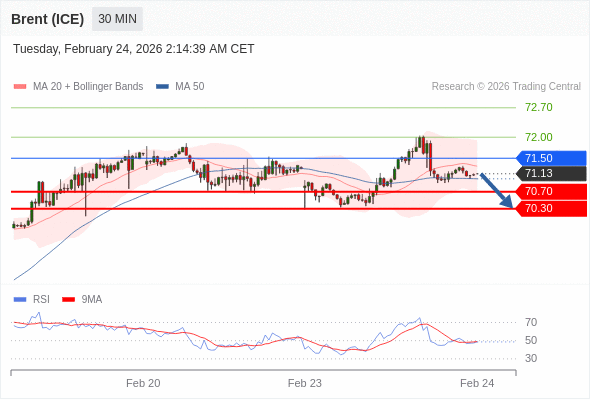 交易策略: 在 71.50 之下,看跌,目标价位为 70.70 ,然后为 70.30 。