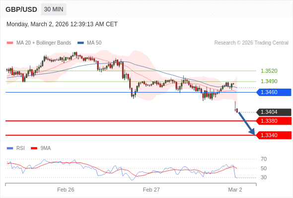 交易策略: 在 1.3460 之下,看跌,目标价位为 1.3380 ,然后为 1.3340 。