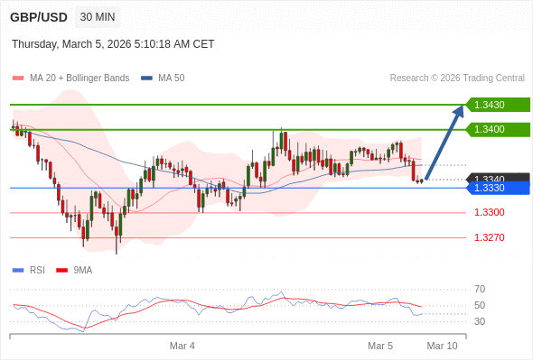 在 1.3330 之上,看涨,目标价位为 1.3400 ,然后为 1.3430 。