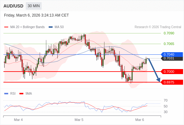 交易策略: 在 0.7040 之下,看跌,目标价位为 0.7000 ,然后为 0.6975 。
