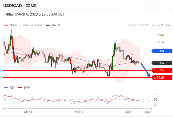 在 1.3690 之下,看跌,目标价位为 1.3635 ,然后为 1.3615 。