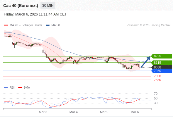 法国CAC指数期货 (Euronext) (H6) 当日内: 期待上涨。