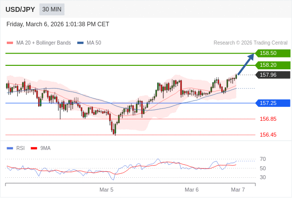 在 157.25 之上,看涨,目标价位为 158.20 ,然后为 158.50 。