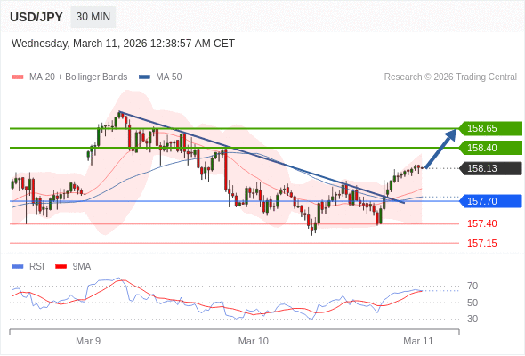 在 157.70 之上,看涨,目标价位为 158.40 ,然后为 158.65 。