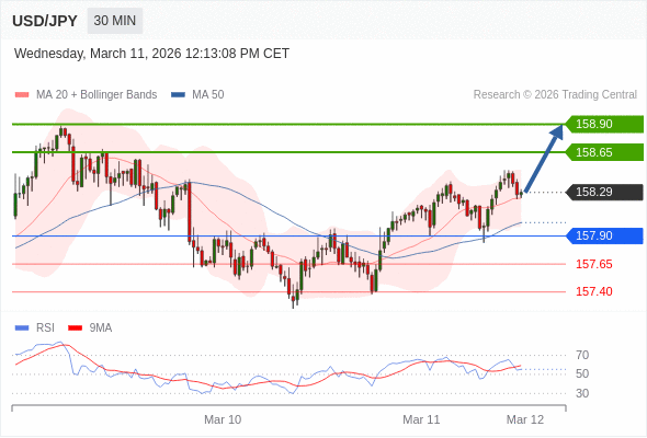 在 157.90 之上,看涨,目标价位为 158.65 ,然后为 158.90 。