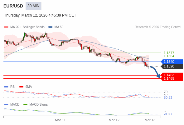 欧元/美元 当日内 : 看跌,在 1.1540 之下。