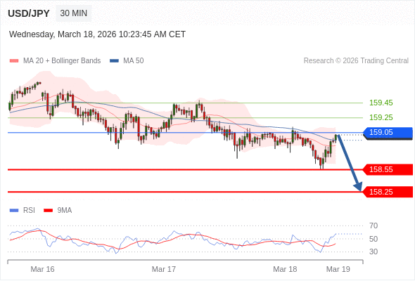 交易策略: 在 159.05 之下,看跌,目标价位为 158.55 ,然后为 158.25 。