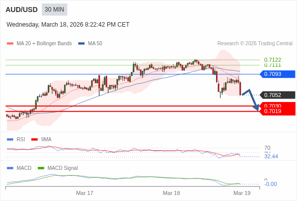 澳元/美元 当日内 : 看跌,在 0.7093 之下。
