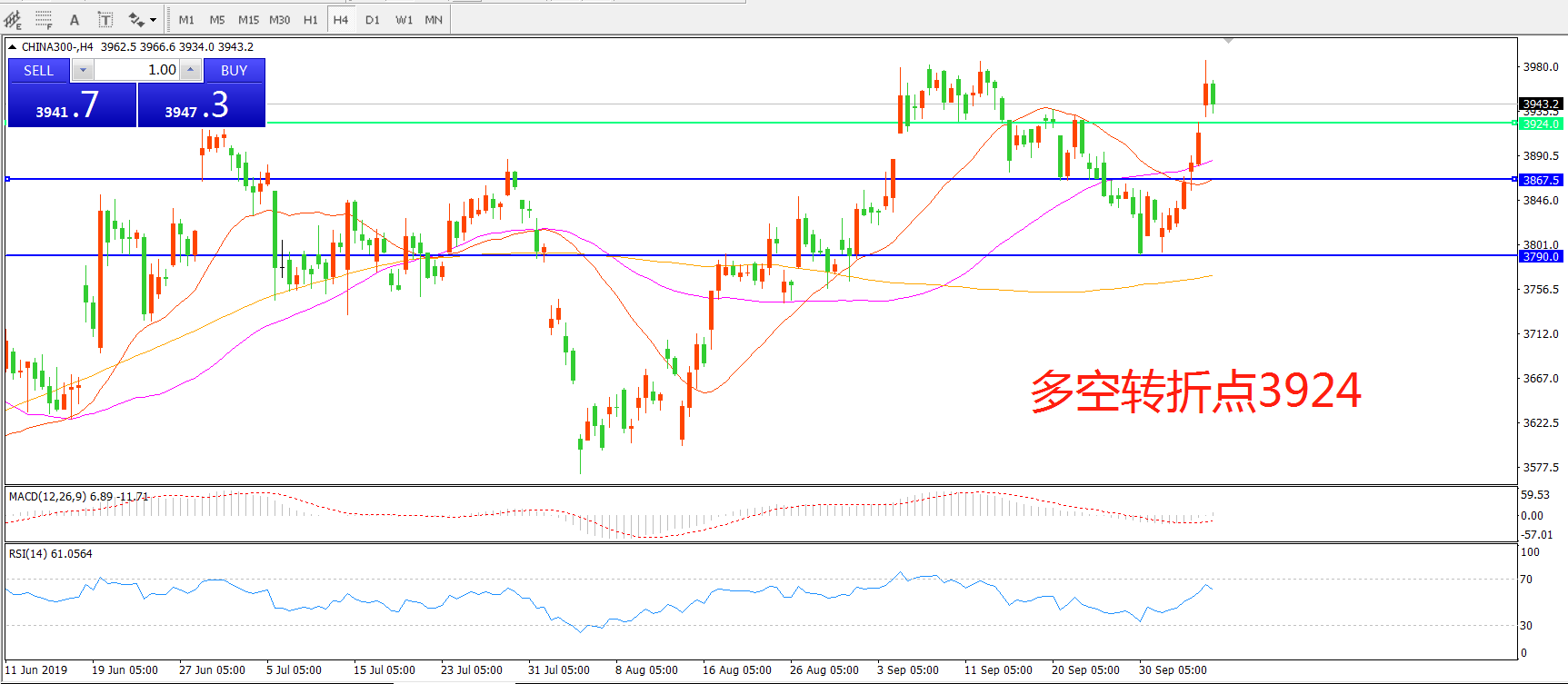 4小时图看,沪深300阳线,虽然尾盘冲高回落,但短期走势仍然偏强,392一线被突破,行情有望新来新一波涨势,均线系统走平,MACD绿柱缩短,红柱增加,RSI指标向下,日内延续上行概率较大。