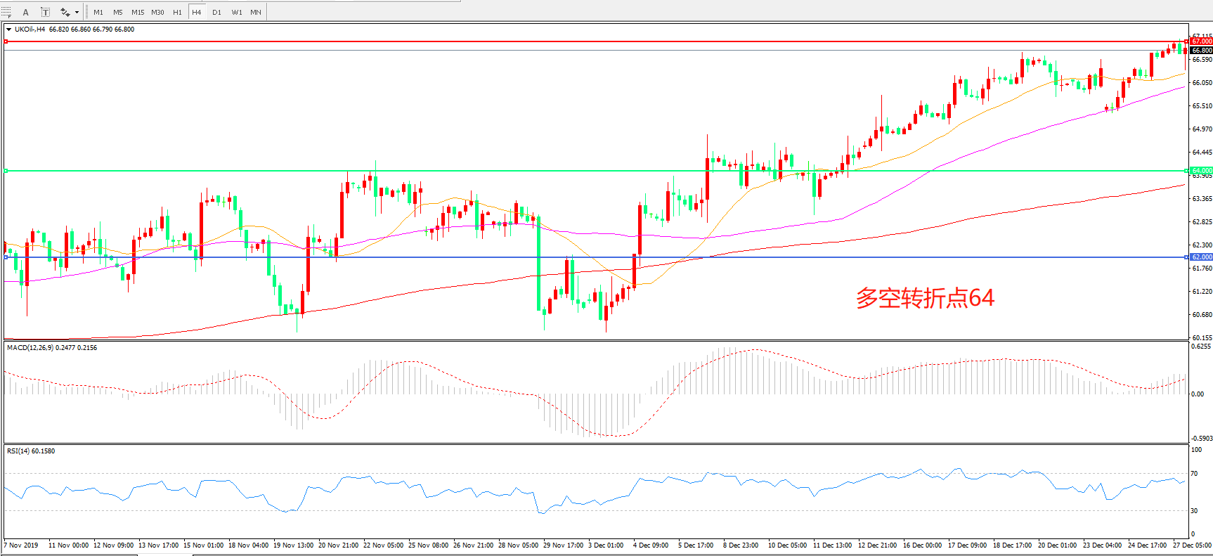 4小时图看,油价呈现高位震荡,67美元成为短线阻力,MACD红柱增加,RSI指标邹平,日内震荡上行概率较大。