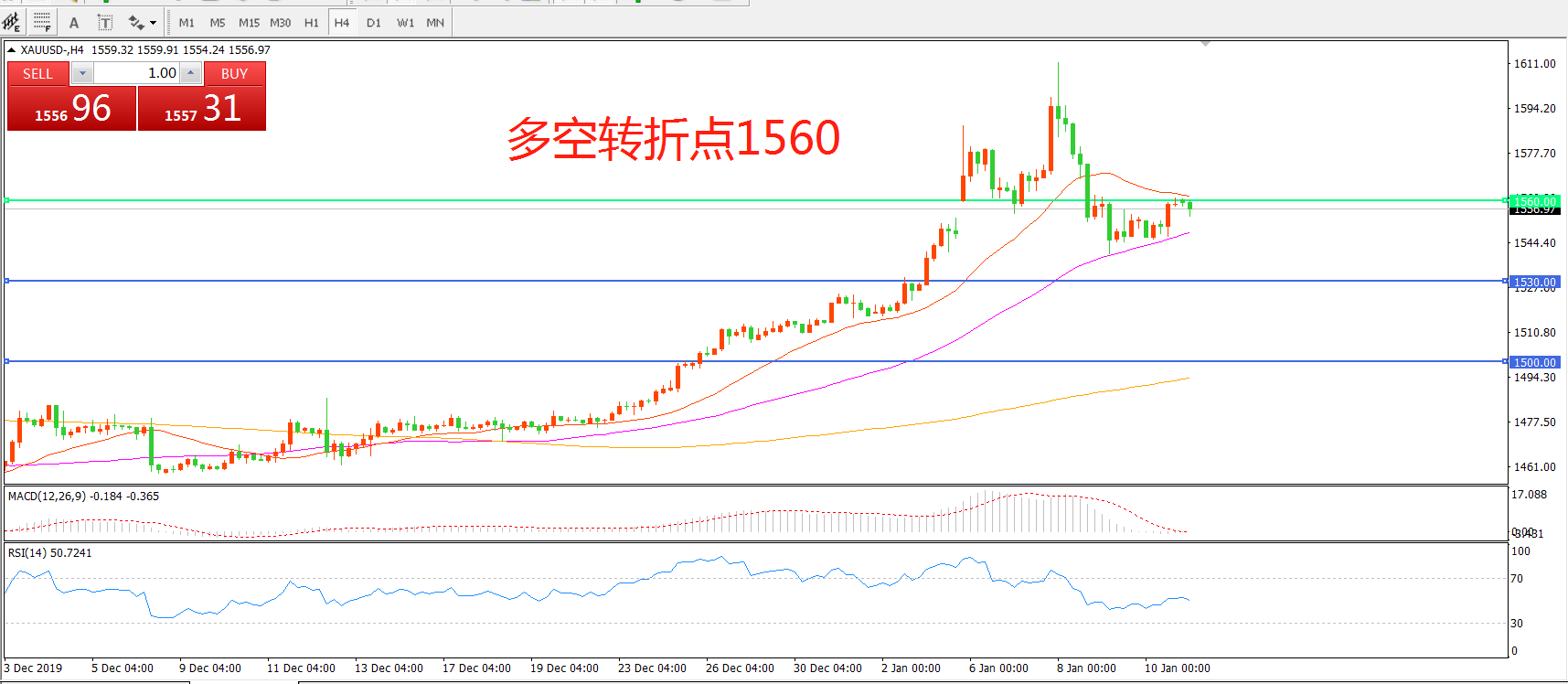 多空转折点:1560.00