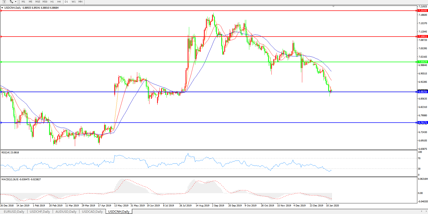 交易策略: 在7.0000之下,看跌,目标价位为6.8820,然后为6.7600。