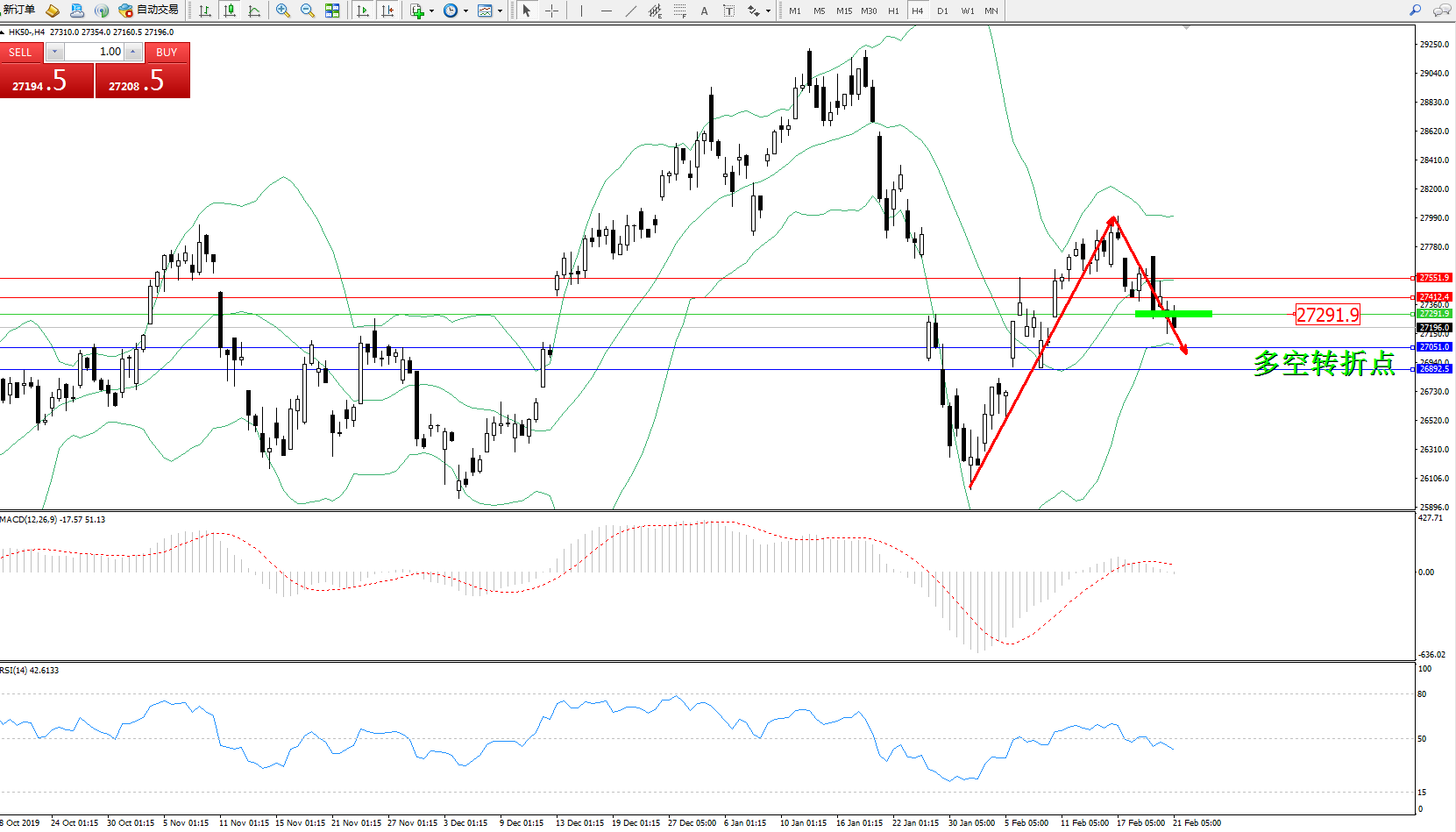恒指HK50 ——4小时K线图显示: