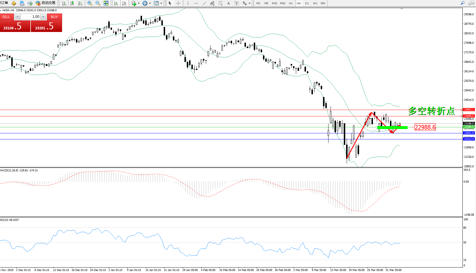 恒指HK50 ——4小时K线图显示: