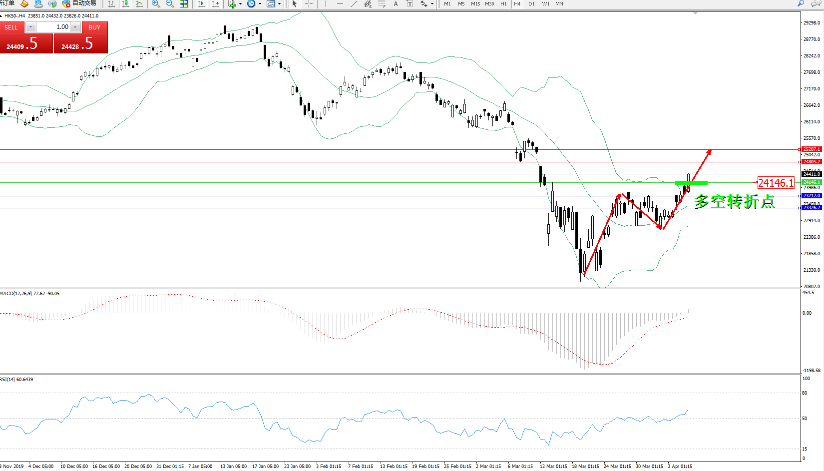 恒指HK50 ——4小时K线图显示: