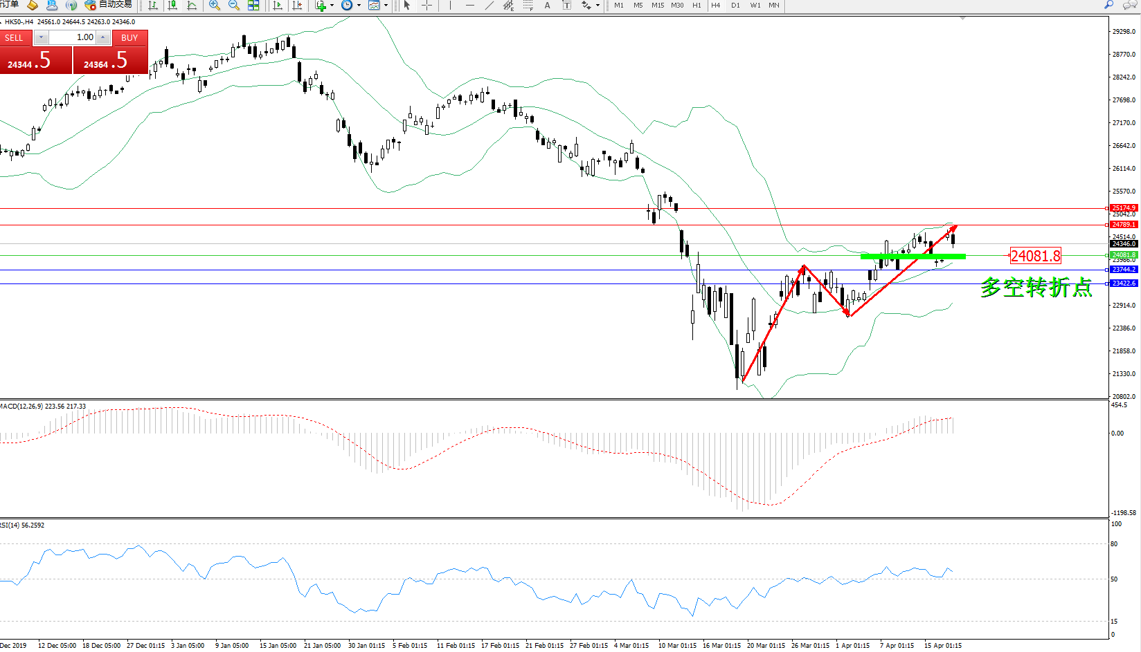 恒指HK50 ——4小时K线图显示: