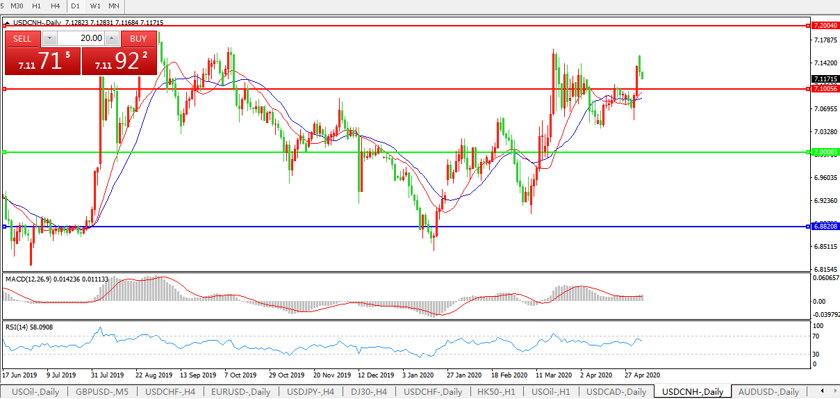 技术面简析:日图均线延续走强态势,汇价大幅拉升后回落整理,MACD开始走平但量能开始放量,RSI冲高回落,预计短期汇价或将进一步上行,关注7.1关口的争夺。
