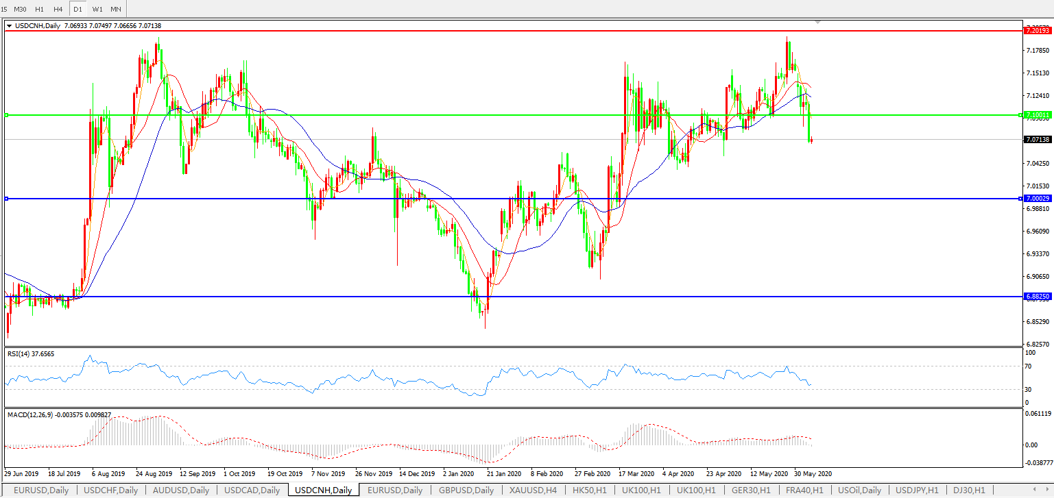 技术面简析:日图均线开始呈有序空头排列,汇价快速走弱跌破7.10关口,MACD开始走弱且量能0轴下放量,RSI持续走弱,预计短期汇价或将进一步下行,关注7.00关口攻守。