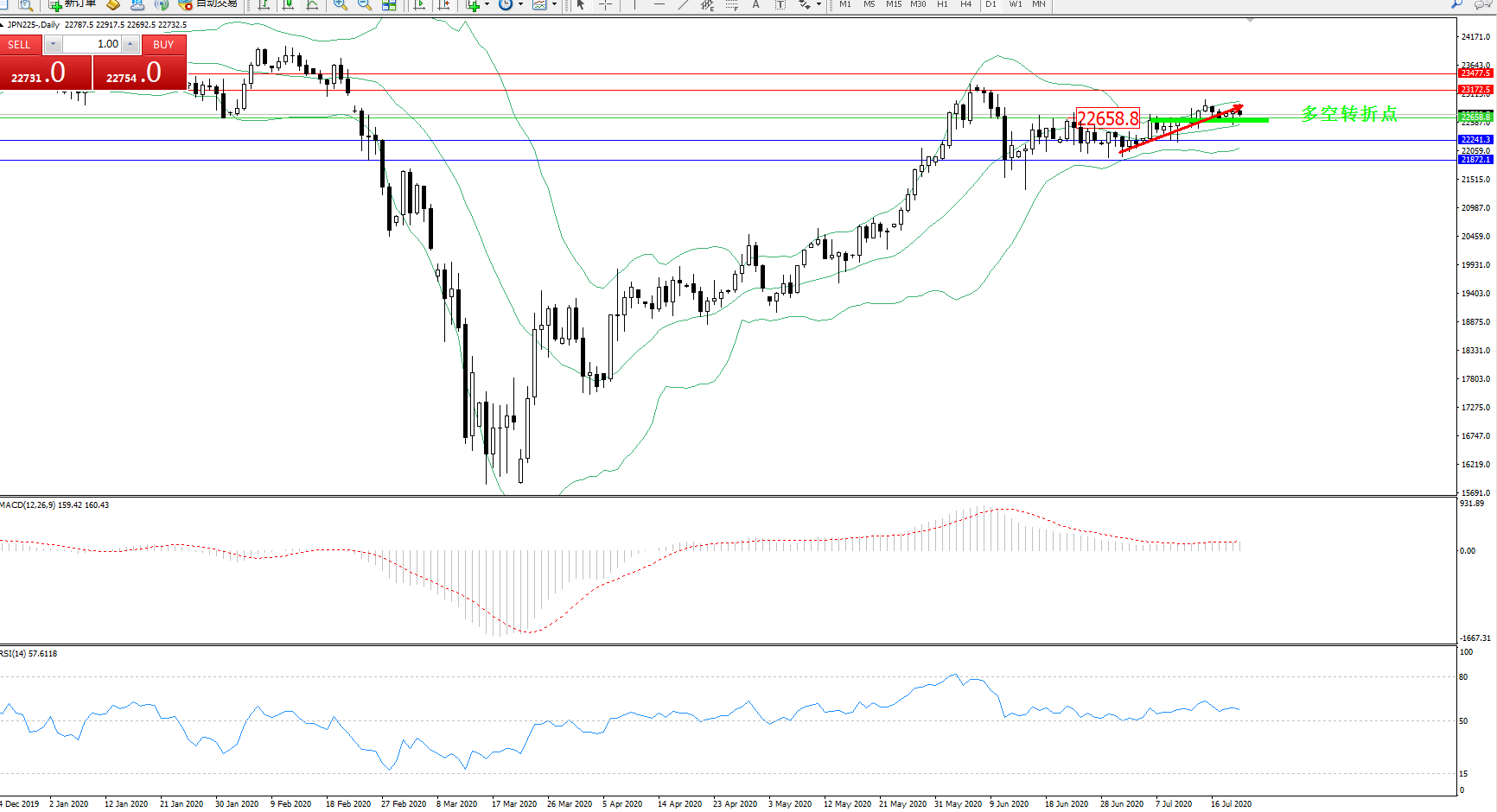 日经225指数7月21日(周二)收盘上涨189.52点,涨幅0.83%,报22907.00点。本6月份核心消费者价格3个月来首次止跌,因为日本解除国家紧急状态,允许部分经济活动重启,尽管新冠疫情冲击仍在持续;政府周二公布不包括新鲜食品在内的消费者价格同比持平,而经济学家的预估为下跌0.1%;4月份该指标三年多来首次下跌,引发了通货紧缩的担忧;虽然企业开始恢复营业,但新冠疫情的冲击可能持续存在。鉴于失业和经济活动减少,消费者价格料长期承压;日本央行上周公布最新展望报告,预测本财年消费者价格下跌0.5%;根据日本央行的估计,到2023年3月,通货膨胀率都不大可能达到其2%的目标的一半;日本央行行长黑田东彦上周表示,日本经济已经度过最糟时期,但复苏将缓慢,仍准备必要时采取进一步行动。