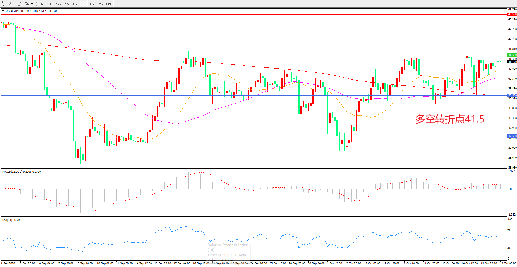 4小时图看,油价延续宽幅震荡,整体表现有所回暖,55均线成为短期支撑,41.5成为上方阻力,MACD红柱增加,RSI指标走平,日内延续震荡概率较大。