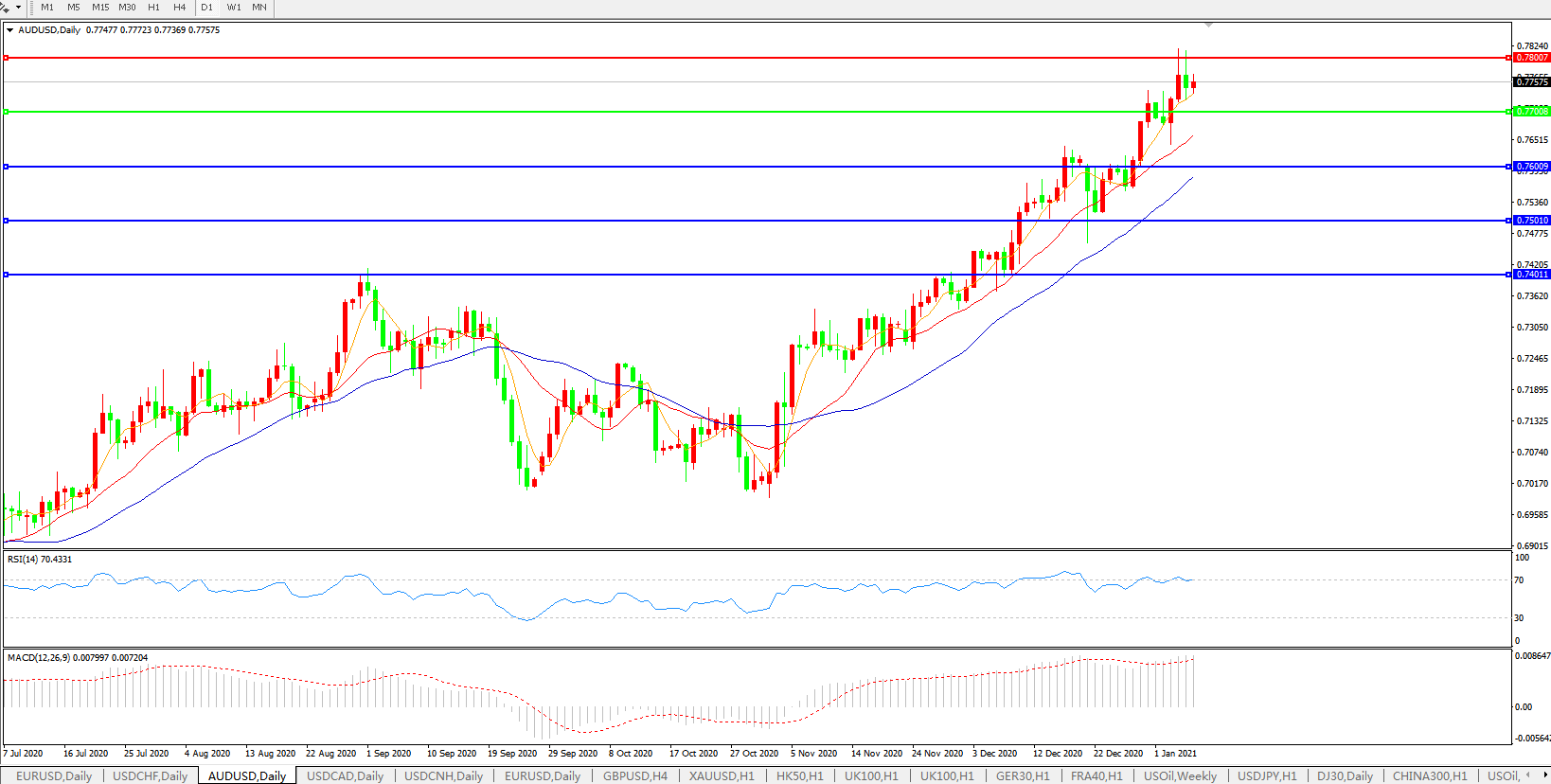 交易策略:0.7700上方看涨,目标0.7800、0.7900