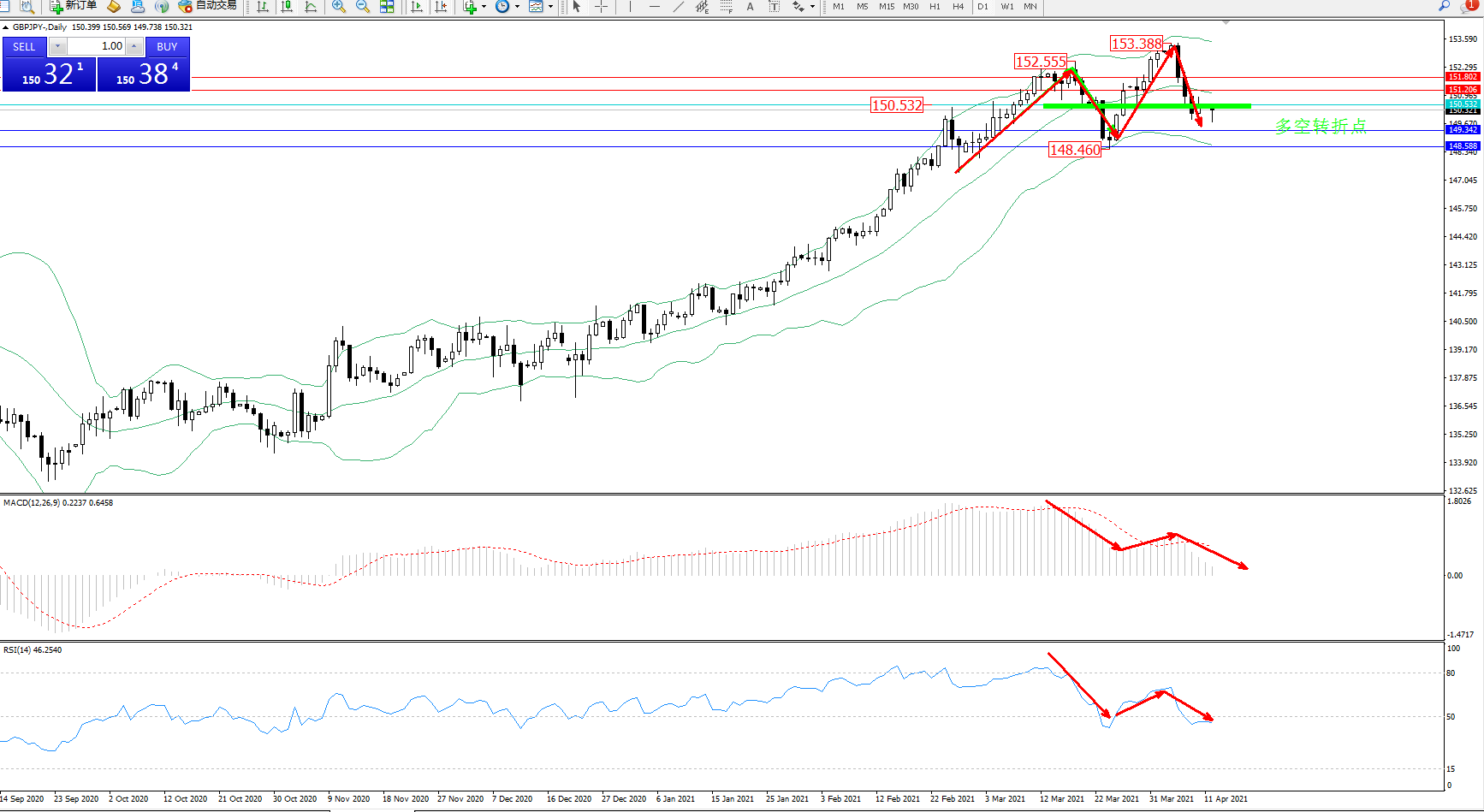 技术点评:多头动力延续布林带指标通道持续震荡上扬,高位抵达153.388位置节点遇阻回撤,急速下挫至中下轨区间震荡下行中,空头动力日渐强劲,布林带指标不断拉升上扬后,高位开始有反转平移走势,MACD指标处于多头区域持续震荡向下移动中,RSI指标高位急速下挫至0轴线下方徘徊;