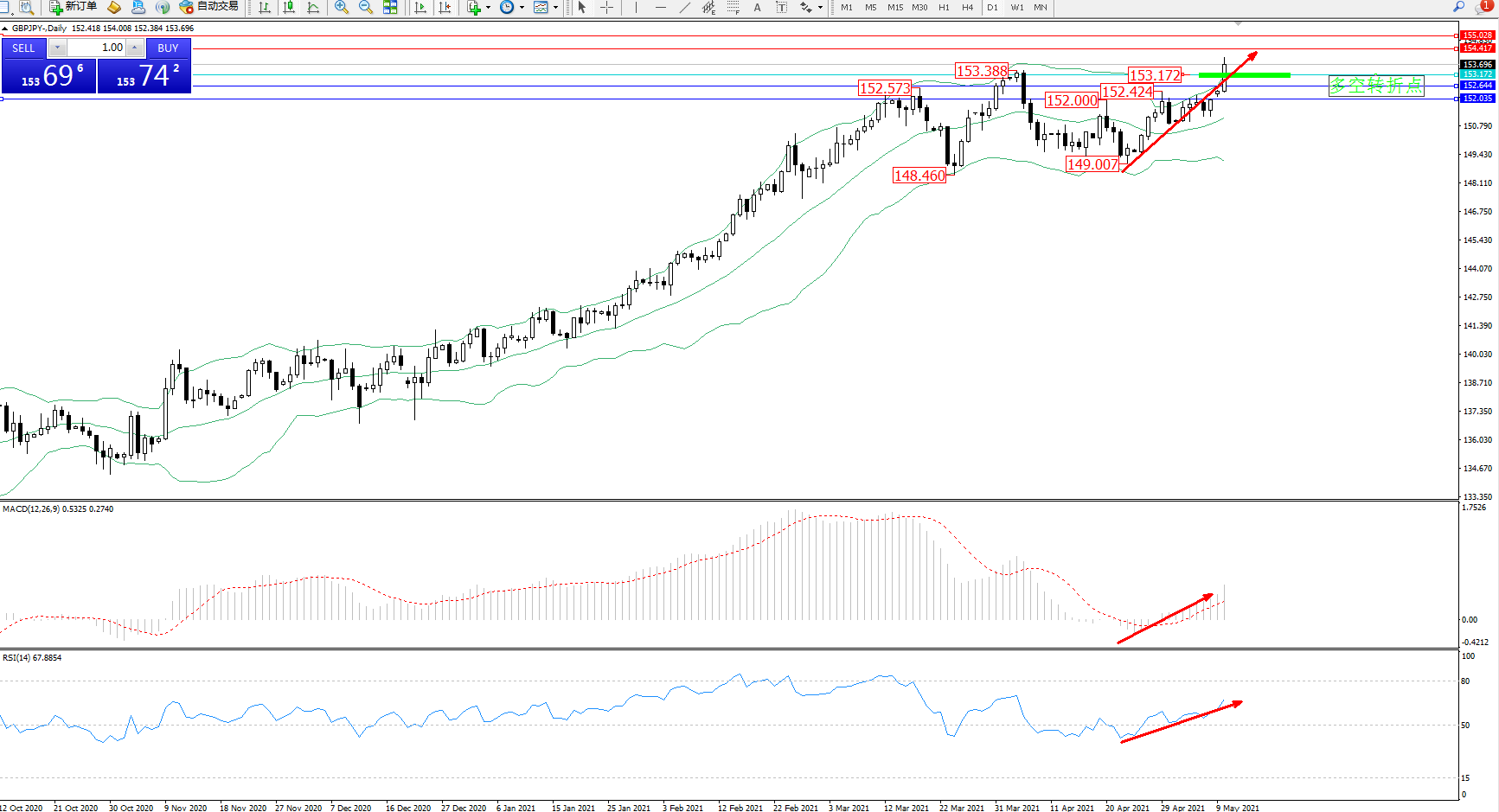 交易策略:153.172上方看涨,目标154.417、155.028