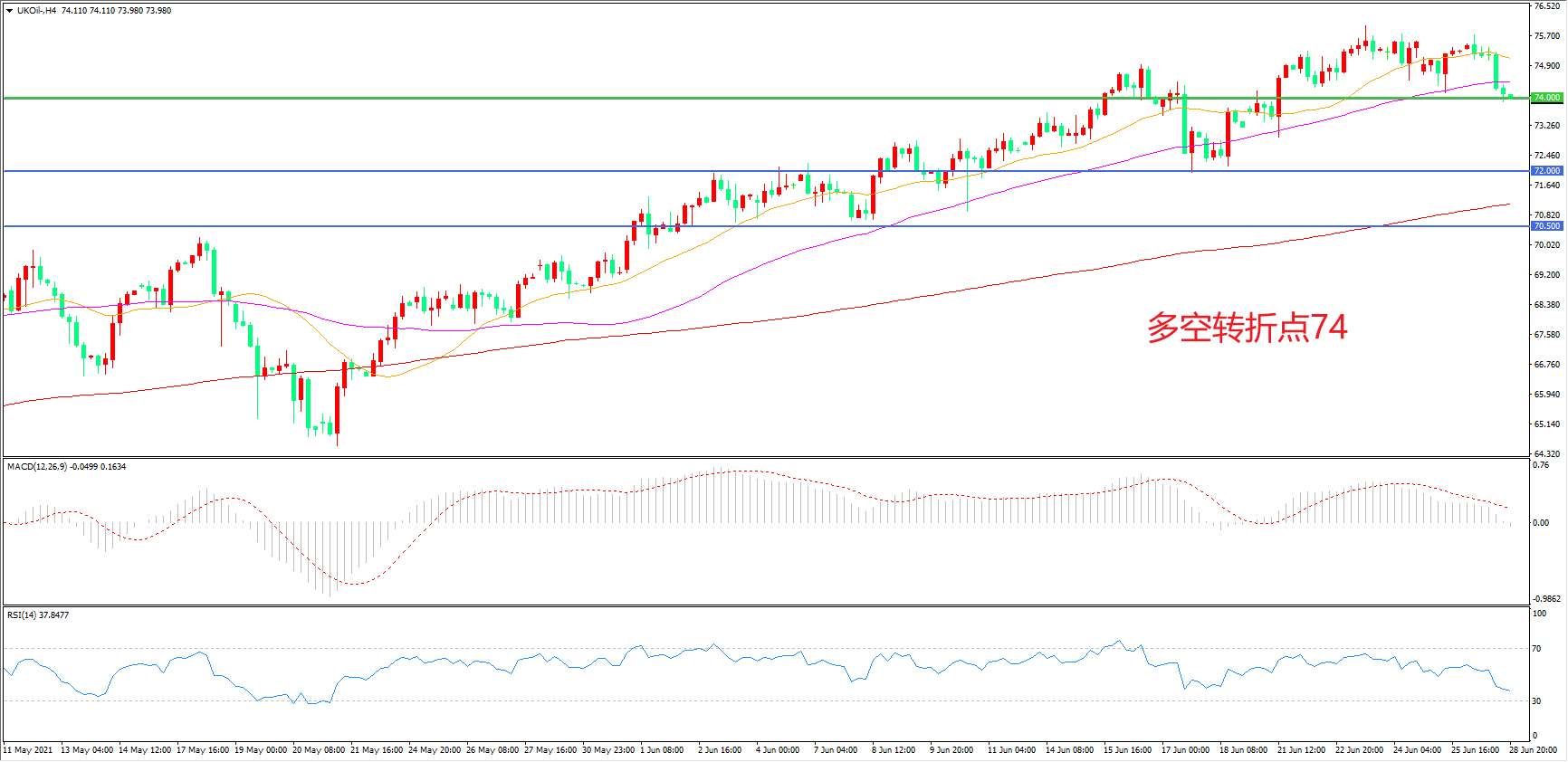 4小时图看,油价高位调整后震荡回落,上行趋势暂缓,但上升形态依然完好,MACD红柱缩短,RSI指标向下,日内延续震荡概率较大