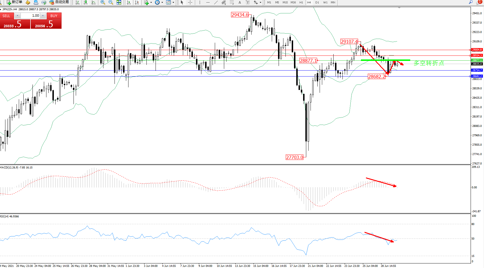 交易策略:28877下方看跌,目标28754、28682