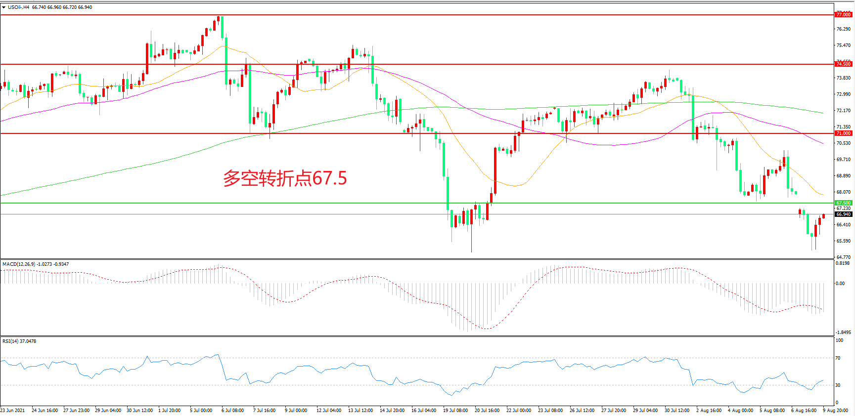4小时图看,油价跳空低开后延续低位震荡,67.50美元成为短期多空分水岭,均线系统呈空头排列,MACD绿柱增加,RSI指标走平,日内震荡下行概率较大。