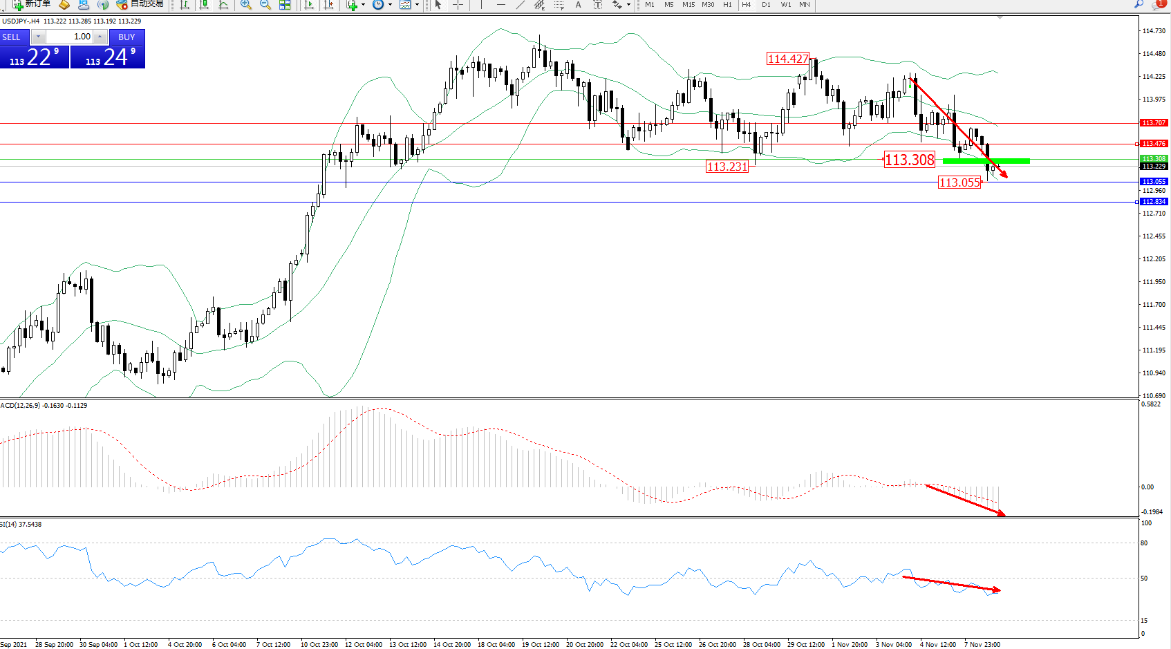 交易策略:113.308下方看跌,目标113.055、112.834