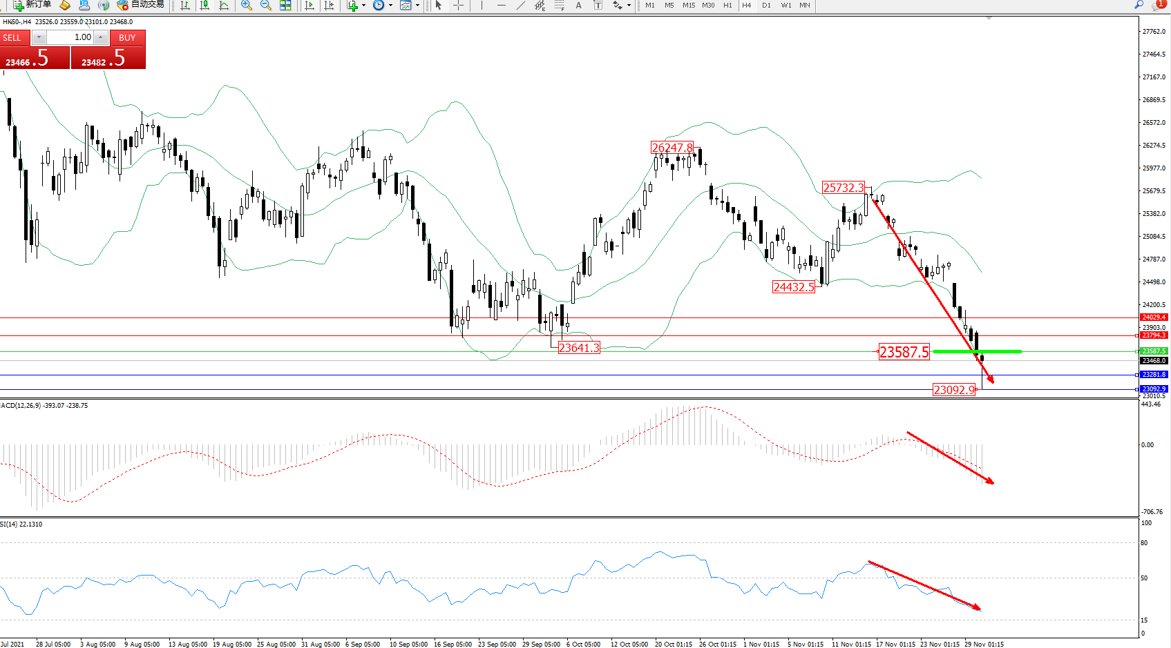 恒指HK50 ——4小时K线图显示: