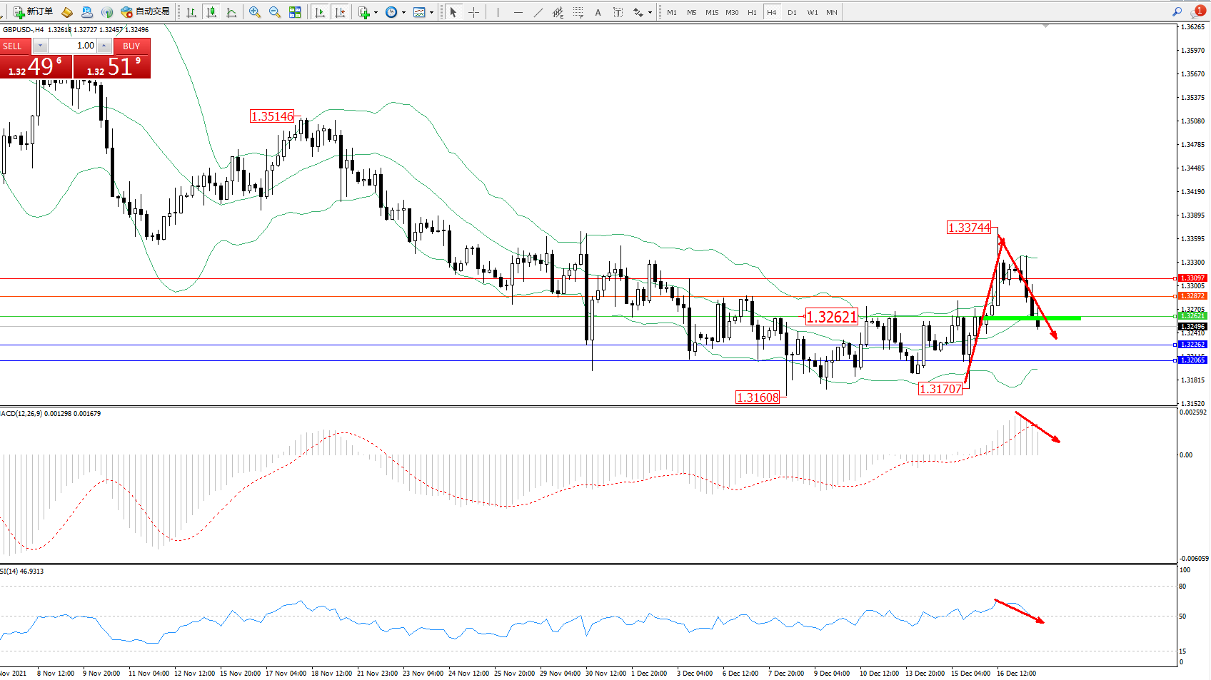 交易策略:1.32621下方看跌,目标1.32262、1.32065