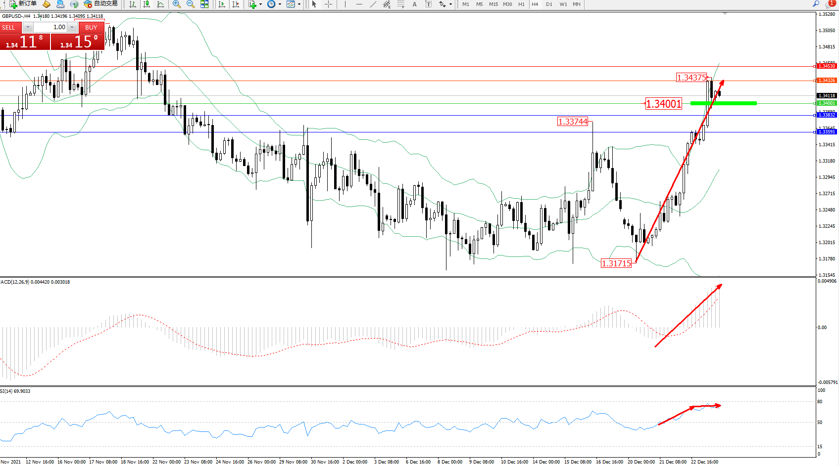 交易策略:1.34001上方看涨,目标1.34326、1.34530