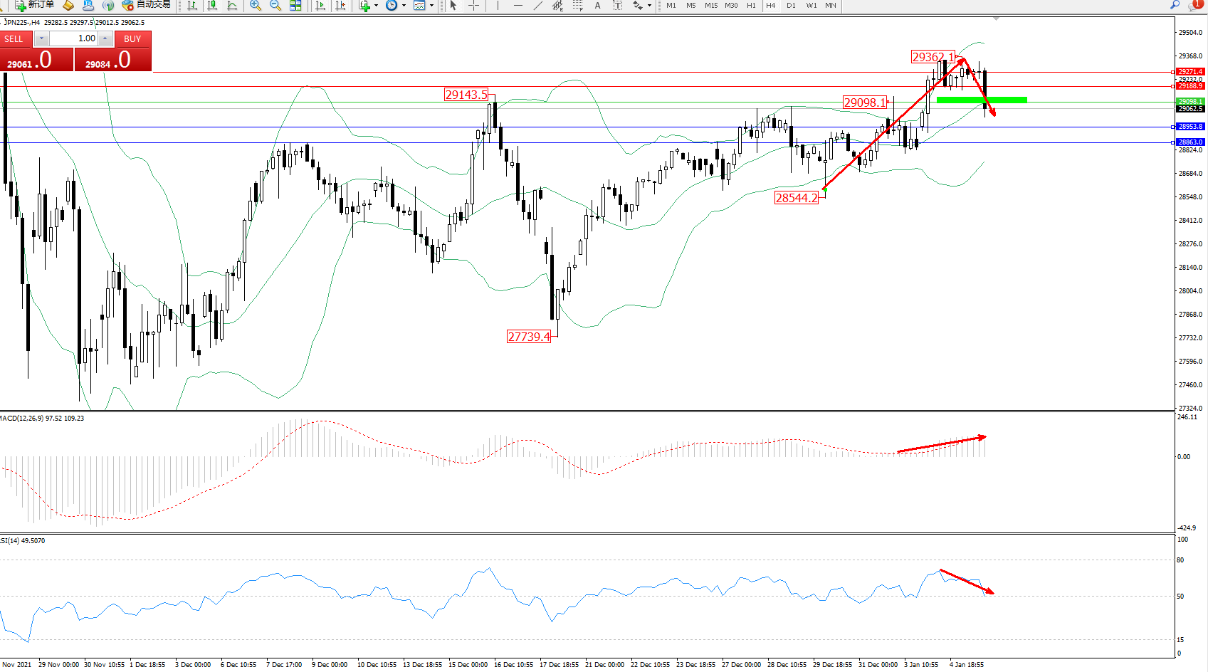 技术点评:多头动力延续布林带指标通道中上轨区间持续震荡上扬,高位抵达29362位置附近遇阻回撤,触及布林带指标中轨附近节点后有继续回撤下行迹象,布林带指标呈张口走势后开始收口,MACD指标处于多头区域维持整理平移后有反转下行迹象,RSI指标处于多头区域持续整理平移后持续下挫至50均衡线附近节点;