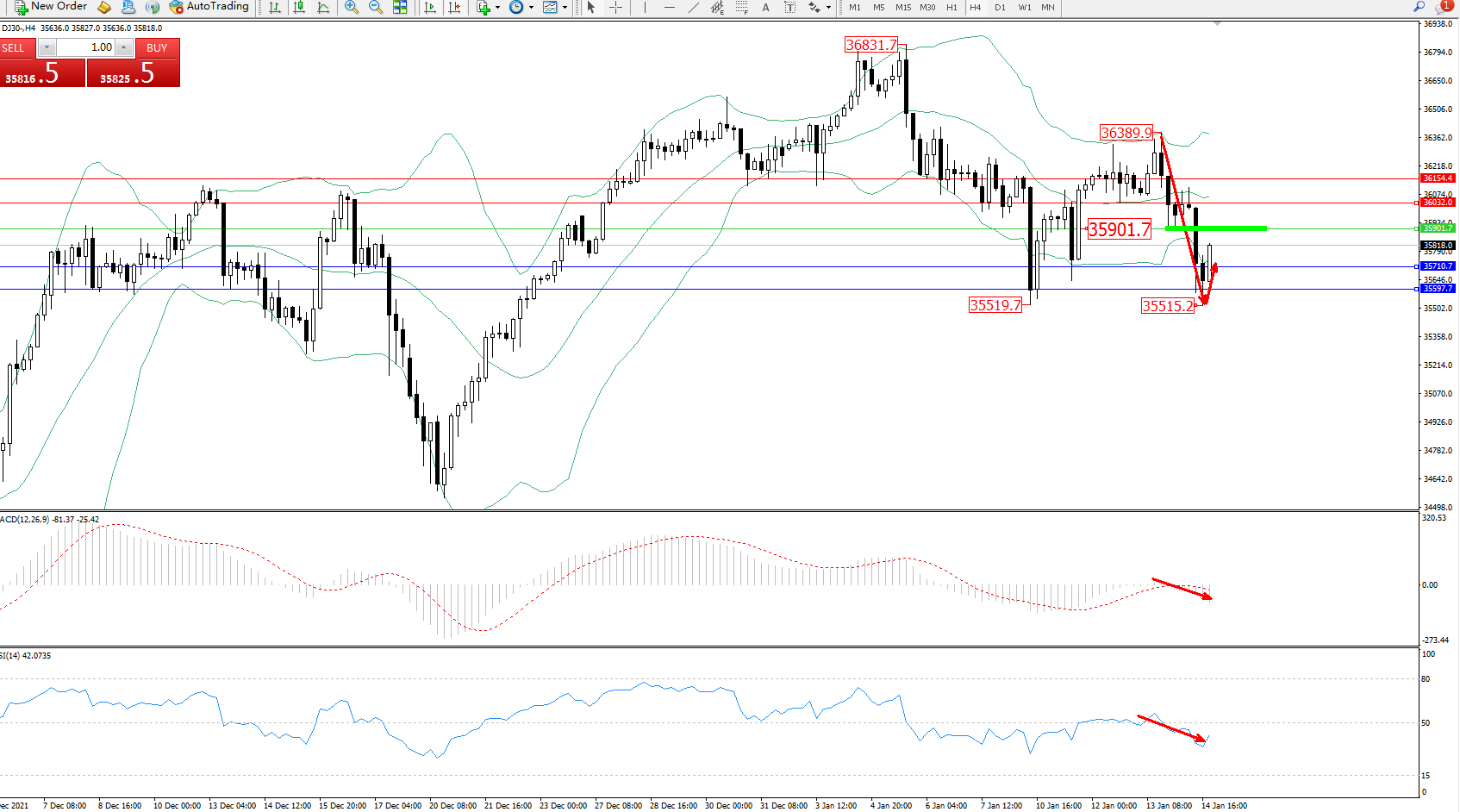 交易策略:35901下方看跌,目标35710、35597