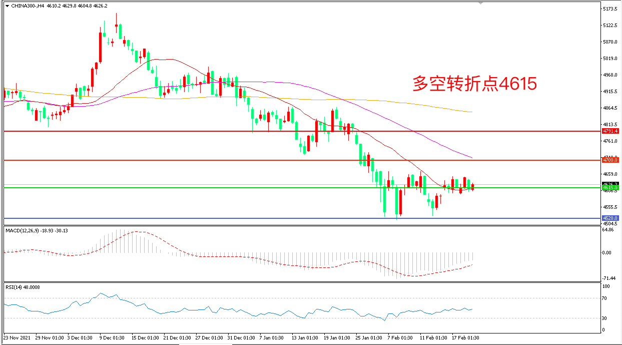 周一(2月21日),受外围股市下跌影响,A股小幅低开后震荡走低,沪深300延续窄幅震荡,收报4626.2点。两市成交继续低迷,依然未能突破万亿,量能没有明显放大,所以走势就是不温不火,在诸多不确定性下,场外资金的观望情绪依然浓厚,因此当下能做的还是耐心等待底部企稳后出现加仓信号。