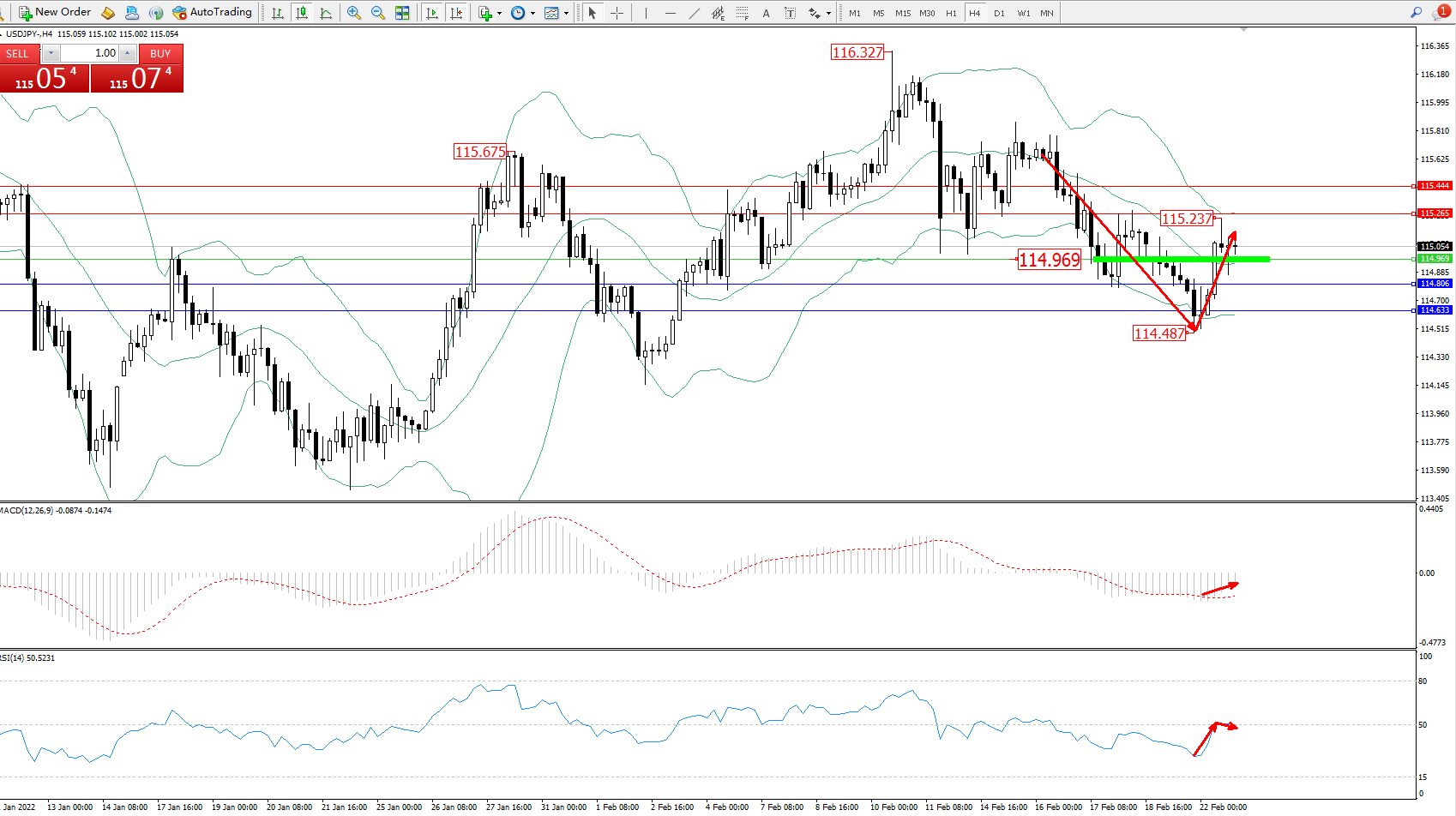 技术点评:空头动力延续布林带指标通道中下轨区间持续震荡下行,低位抵达114.487位置后得支撑快速拉升,多头动力伺机入场,上移至115.237附近节点后开始震荡,短期纠结于布林带指标通道中上轨区间震荡,布林带指标呈向下移动趋势走势后开始整理平移,MACD指标处于空头区域维持弱势缓慢向上移动,RSI指标处于空头区域维持整理上移至50均衡线附近徘徊中;