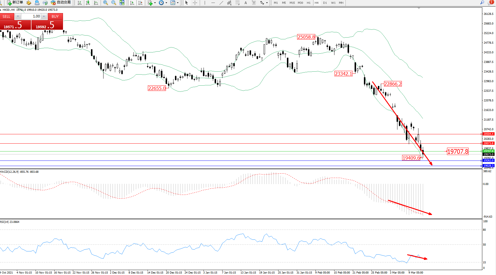 恒指HK50 ——4小时K线图显示: