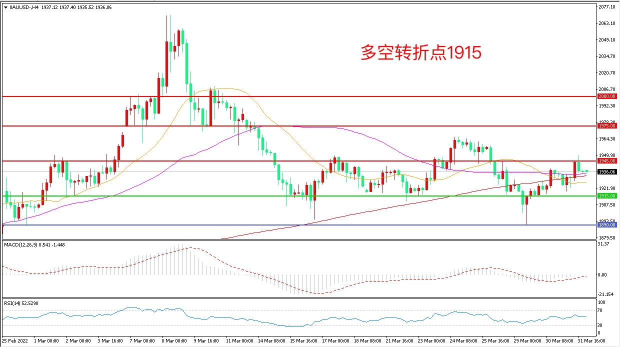 周四(3月31日),北约秘书长称俄军正在乌克兰进行重新部署和集结,准备在顿巴斯地区发动新的攻势,而美联储最青睐的的PCE数据录得5.4%,刷新1983年以来新高,多重利好推动金价大幅走强,收报1936.57美元/盎司。今晚市场将迎来最重磅的非农就业人口数据,如果数据表现不及预期,可能会对黄金形成新的支撑。
