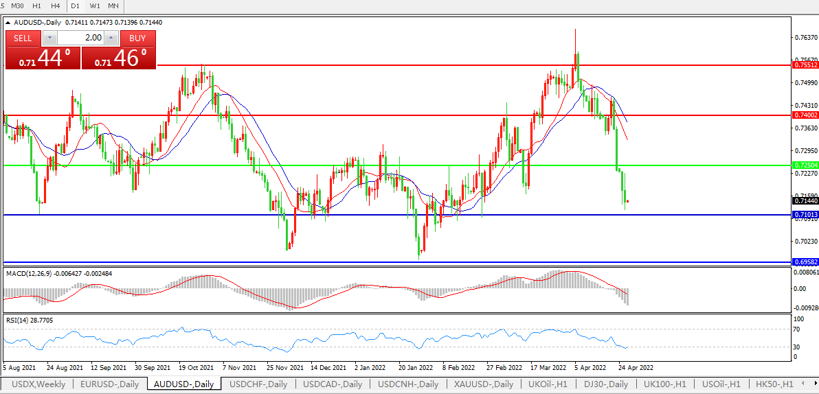 交易策略:0.7250下方看跌,目标0.7100、0.6950