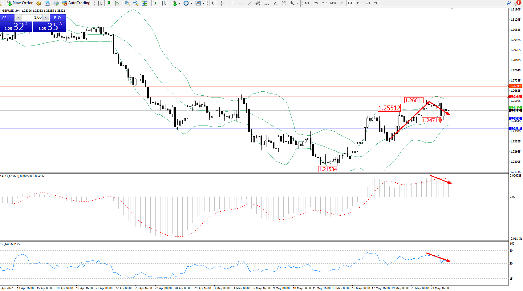 交易策略:1.25512下方看跌,目标1.24793、1.24155